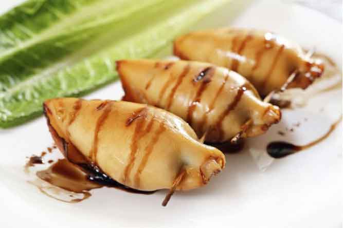 • Al cuerpo de los calamares se le hace un pequeño corte en la punta para evitar que revienten al cocer y se salga el relleno.