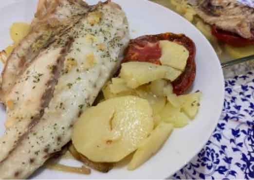 - En ese tiempo la corvina quedará jugosa y las patatas terminarán de hacerse.