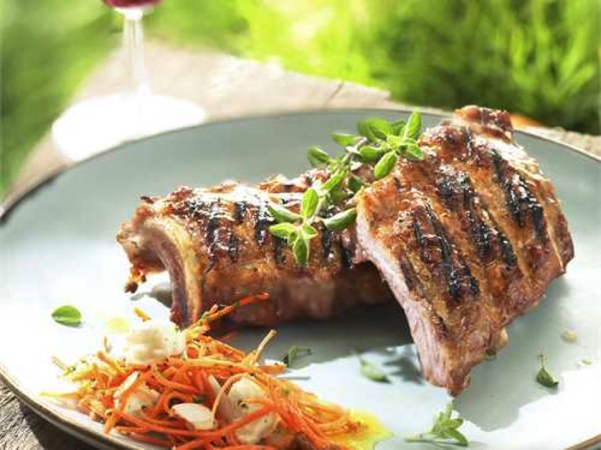 • Presentación: Rebozar los cubos de manzana en el polvo de nueces fritas. Calentar las costillas y cuando estén bien calientes, glasear con fondo oscuro bañándolas constantemente. Pintar la superficie con el glaseado y gratinar ligeramente. En la parte superior del plato, poner 3 und. de manzana rellena, debajo cuatro botones del puré. Poner una pequeña cantidad de reducción de zumo encima de cada botón. Terminar con la ralladura de cítricos. Colocar la carne glaseada, salseando con el fondo oscuro muy reducido. Terminar con cebollino picado.