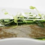 Presentación: Disponer en el plato los lomos de atún, sobre él los espárragos y aliñar el conjunto con el pesto de nueces.