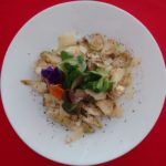 Decorar con cebollino picado, brotes o flores comestibles, espinacas baby o rúcula y jamón ibérico picado.
