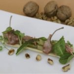 Para presentar, colocar sobre el pan la berenjena asada, las hojas frescas y las costillitas de conejo. Acabar de aliñar y decorar con las nueces peladas.