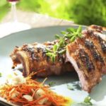 Presentación: Rebozar los cubos de manzana en el polvo de nueces fritas. Calentar las costillas y cuando estén bien calientes, glasear con fondo oscuro bañándolas constantemente. Pintar la superficie con el glaseado y gratinar ligeramente. En la parte superior del plato, poner 3 und. de manzana rellena, debajo cuatro botones del puré. Poner una pequeña cantidad de reducción de zumo encima de cada botón. Terminar con la ralladura de cítricos. Colocar la carne glaseada, salseando con el fondo oscuro muy reducido. Terminar con cebollino picado.