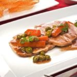 Servir los medallones de cerdo con la salsa, acompañado de algunas verduritas 8guisantes y zanahoria).